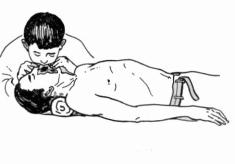 7假如病员始终是嘴唇紧闭无法张开,那么可以改用口对鼻人工呼吸,操作方法同上,只是吹气的对象换成是病员的鼻子。