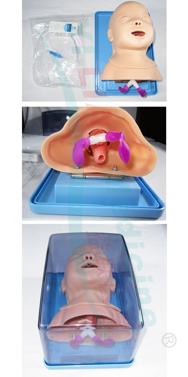 婴儿气管插管训练模型气道狭窄并且需要插管多是由于气道堵塞或者呼吸功能不佳,缺氧时间过长会导致新生儿缺血缺氧脑病,后果很严重,因此需要最快速度插管。操作者站模型头侧,将口张开;使用时口、咽、喉先喷以肥皂水和洗涤精进行;左手握喉镜把镜片伸入舌根,向上提拉,此时就会看到会厌软骨,将镜片逐渐移至舌根会厌各处,继续上提镜片,会厌软骨就会反跳复牢镜片,其下的菱形气管口便清晰可见。右手拿气管内导入伸入口内与润滑剂接触后,在直视下将导管插入气管;关于气管导管是否插入气管,模型头部颈部截面通出的半透明气管支气管部分可看到模型气管导管;把模型头竖起来,在其后孔内扳开咽后壁可见气管导管是否已插入气管内;用气囊面罩复苏器的面罩端改接气管导管,予以加压充气,模型肺就会扩大,说明导管插在气管内。
