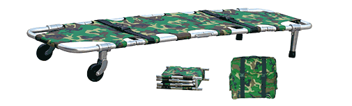本担架四折叠带背包,带轮、带支腿。采用高强度铝合金材料和牛津革担架面制成,它具有重量轻,体积小,携带方便、使用安全、易消毒清洗等优点,主要适用于野外救护。