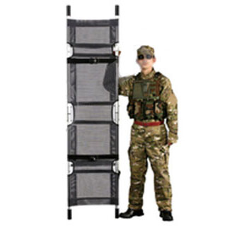 本担架带支腿,带手提背包。采用高强度铝合金材料制成,主要适用于野外救护。