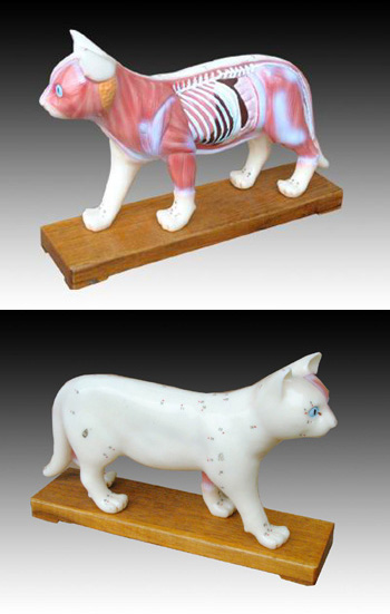 本模型显示猫体左半部36个常用穴位,穴位用数字标注。右半部显示解剖面。用PVC制成,供兽医作参考用。