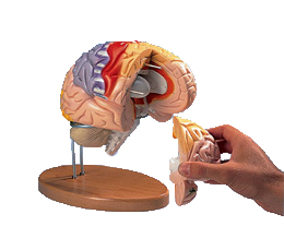 这款脑模型为实物的2倍大小,中切,可分解成4部分。前叶和脑干可拆卸。清晰展示了运动中枢、感觉中枢和功能中枢,并以色彩区分。带有中文标注。置于可拆卸基架上。