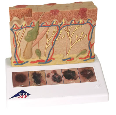 这款3B Scientific®病变模型放大8倍展示了6个不同阶段的黑色皮肤肿瘤的前面和侧面:•健康的皮肤•黑色细胞位于表皮的表面•黑色细胞充满表皮,稍微入侵乳突层•黑色细胞充满乳突层•黑色细胞入侵网状组织层•黑色细胞已达到皮下脂肪纤维,其随体细胞位于静脉附近
