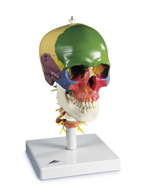 此款模型采用19种豪华色彩来展现头颅各种骨片的形状和关联。竖于颈椎上并能灵活移动(C1, C2 及C7有色彩), 此款模型展示了菱脑、脊髓、颈椎神经、脊椎动脉、基底动脉和后脑动脉。置于基架上。