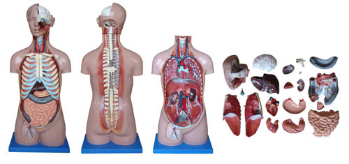 这是一款标准尺寸的无性躯干模型。分成20件:躯干,头,眼球,脑,肺与胸骨和肋骨附件(2件),心脏(2件),胃(2件),肝,脾,肾,肠(4件),膀胱,脊椎神经(2件)。脊椎露在外面,其中一段脊椎可拆下。用PVC制成,安放于塑料座上。尺寸:85CM。