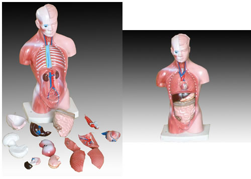 这是一款受欢迎的教学模型,显示15件内脏:躯干,脑(2件),心,食管气管和主动脉,肺(4件),头颅盖,胃,横膈膜,肝,胰和脾,肠。用PVC制成,安放于塑料座上。尺寸:26 CM。