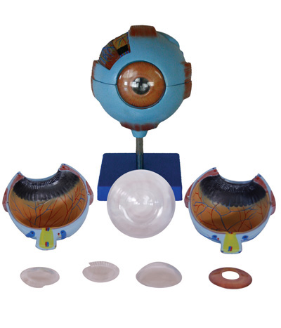本模型适用于中等学校讲解生理卫生课程时作直观教具用。模型用于显示人类眼球的解剖结构,如眼球壁的三层膜(外膜、中膜和内膜)和填充内部的主要折光体、晶状体和玻璃体等。本模型用PVC制成,按实物放大6倍,置于塑料座上,尺寸:15.5CM。