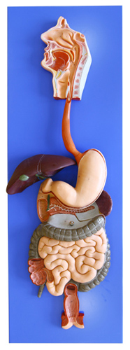 这是一款消化系统的立体模型,实物大小。展示:鼻,口腔和咽喉,食道,胃肠道,肝与胆囊,脾和胰,十二指肠、盲肠和直肠开放。分成3件,置于基板上。