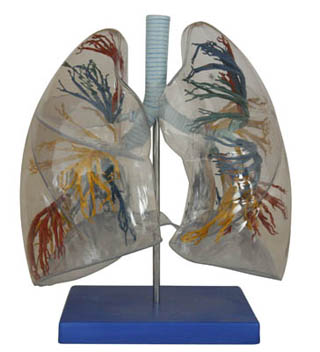 本模型供医学院校讲解人体解剖学、胸外科和内科等课程时作直观教具用。显示左右两肺的分段,左肺八个段,右肺十个段,从透明肺壳可以观察支气管树的分布情况。本模型肺外形用透明塑料制,气管和支气管树用塑料制。用PVC制成,安放于塑料座上。2倍放大。