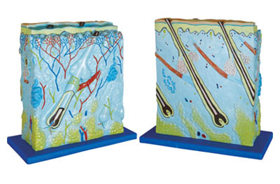放大105倍的人体皮肤的横截面模型。清晰地显示了三层皮肤、头发毛囊、汗腺、脂肪组织等。不可分割。尺寸: 27x10x31CM。用PVC制成,安放于塑料座上。
