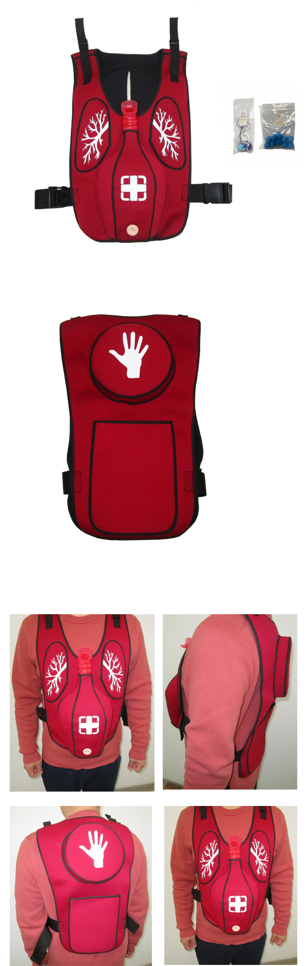 救援培训专用窒息梗塞急救实训穿戴马甲,可有效避免因窒息急救不及时导致生命安全受到伤害。防窒息急救教育和实训的时候,穿戴在学员身上,针对异物造成的呼吸气道堵塞状况时,练习腹部按压(即海姆立克手法),做出正确步骤处理,挤出堵塞气道异物(异物塞).直观的教学模式给学员带来自信和应用实效。模拟者可采用站姿、坐姿、用教具或借助柜台、桌椅,实习体验窒息自救、急救、达到救人一命的教学目的。