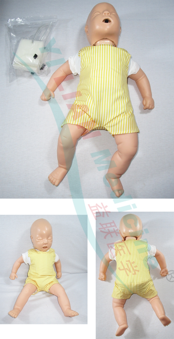 20世纪70年代中期,兴起了海姆立克急救法(Heimlich manauver),简称海氏急救法。该法主要用于气管异物呼吸梗阻、呼吸骤停之急救。气管异物常见于婴幼儿身上,因婴幼儿会厌软骨发育不成熟,功能不健全,在婴幼儿口中含物说话、哭笑、打闹和剧烈活动时,容易将口含物吸入气管内,引起气管阻塞而导致窒息。 气管梗阻的识别是抢救成功的关键:海氏手法是对患者冲击腹部及背部产生向上的压力,压迫两肺部,从而驱使肺部残留气体形成一股气流,长驱直入,将堵塞住气管、咽喉部的异物祛除,因此,海氏手法普遍被国际社会所采用普及。 主要功能: •正常的气道梗塞模拟; •可进行标准的CPR操作:人工呼吸和心外按压; •窒息、异物阻塞气道的模拟; •标准婴儿真人比例设计及准确的标准布局; •精确的解剖结构,可触及胸骨和肋骨。